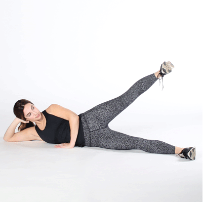 - Lift your top leg as high as you easily can. (You’ll be able to feel the stretch on the side of your hips).